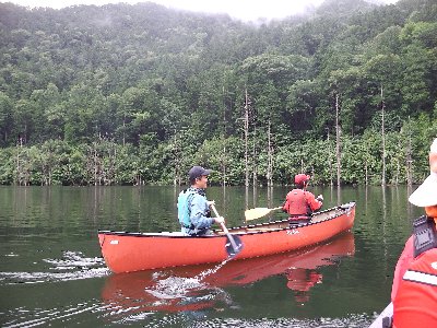 自然湖に到着、幸い雨は止んでいるので、さっそく漕ぎだす。