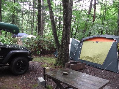 小雨の中、キャンプ設営 |
