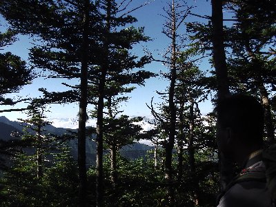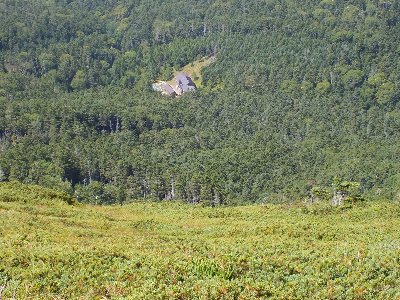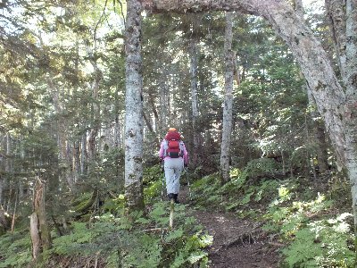 振り返ると、ダケカンバの森が、ハイマツに変わる |
