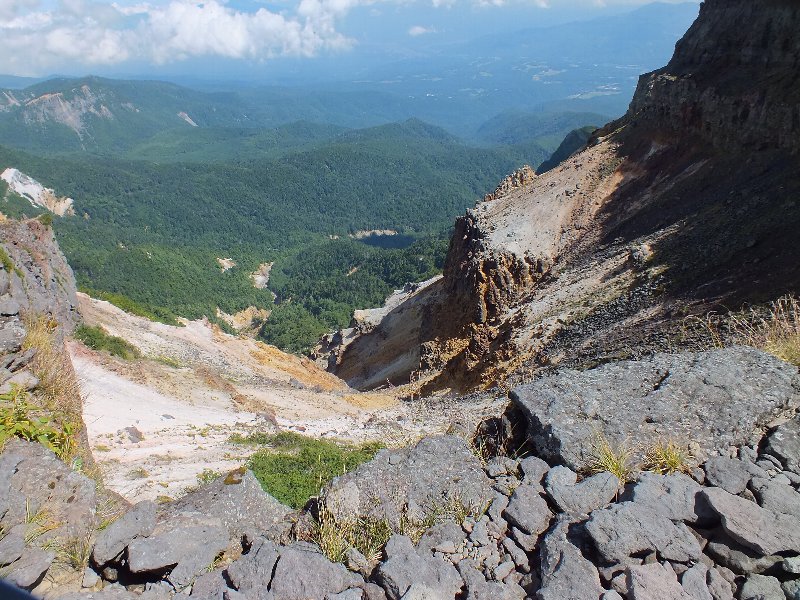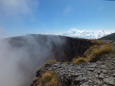 雲の晴れた、爆裂火口を覗く |