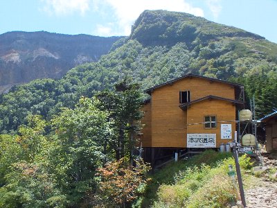 青い屋根が、夏沢峠の山小屋 |