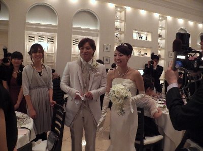 披露宴会場の扉を開くと マスコミカメラマンや テレビカメラが ゲストを迎える。