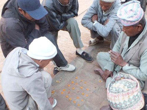 広場の一角におじさんのかたまり・・・みかんの皮を並べて 将棋のようなものをやっている。