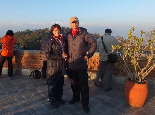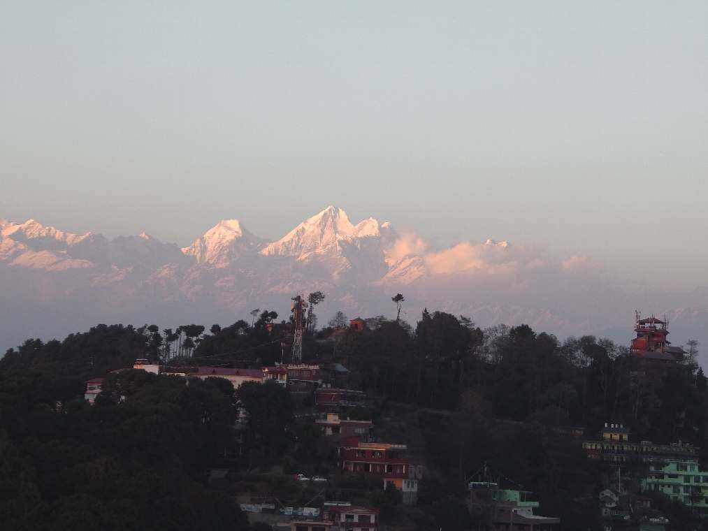 ホテルの屋上から 夕日に輝くヒマラヤ山脈に挨拶。