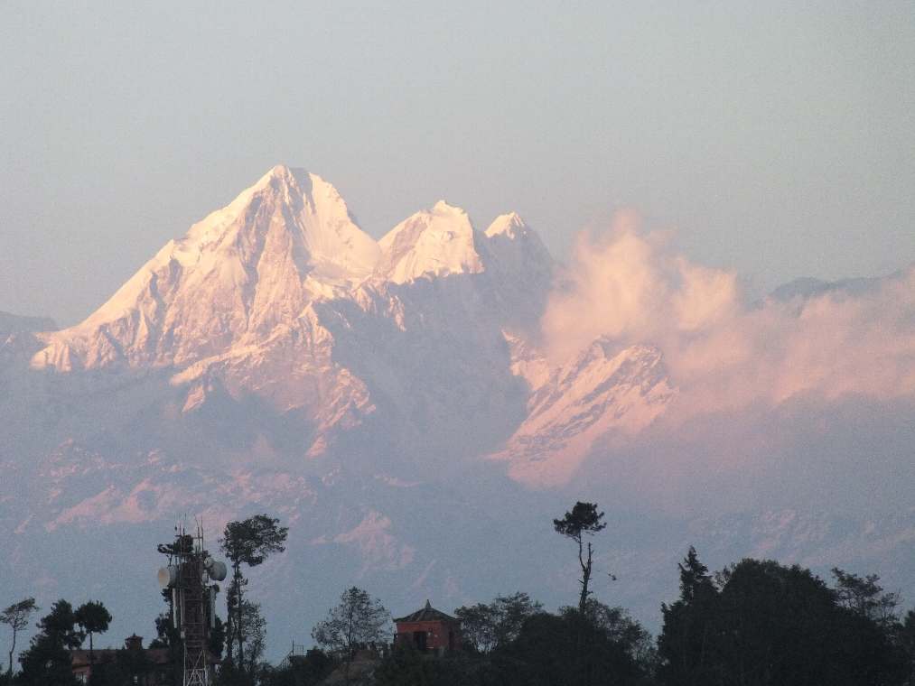 『ヒマラヤの神々に会う ネパールゆったり旅』 ヒマラヤ を見る トレッキング in ネパール 1〜2日目 2013.02.25〜03.04 2013.02.26 夕陽に染まる DORJE-LAKPA(6,966m) ナガルコットから |