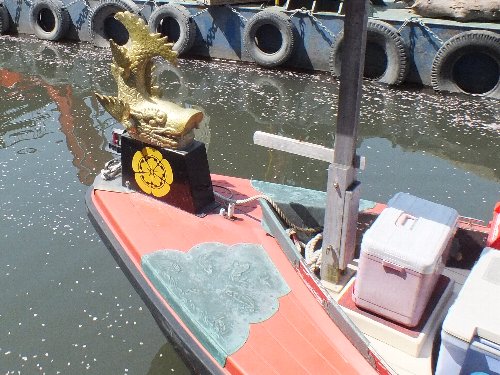桜の花びらの堀川 織田家の家紋の付いた信長号 |