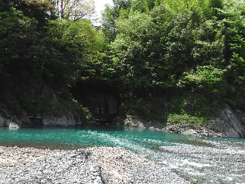 漕ぎ出して最初のカーブ、 大井川ブルーが戻っている様だ。 |