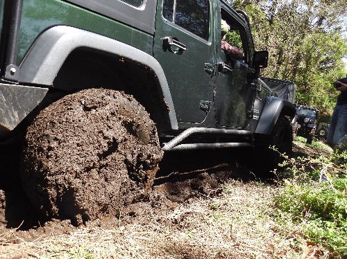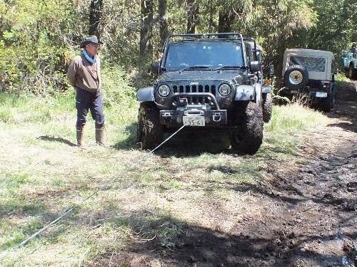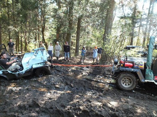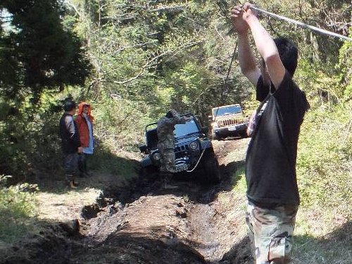 泥沼にはまった、TJラングラーをソフトカーロープで引いて救出。