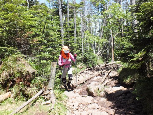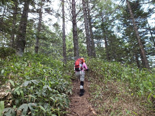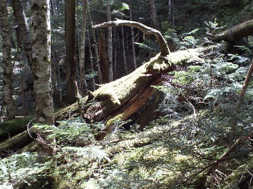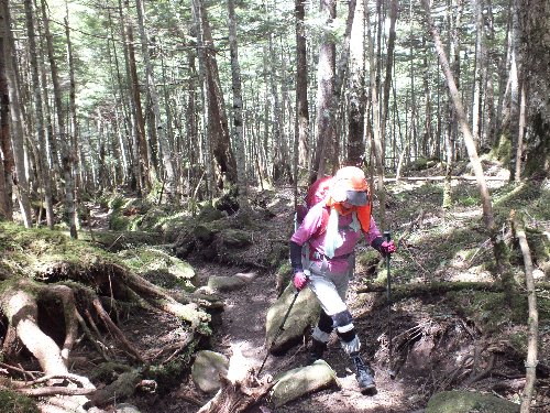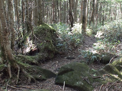 岩の道を過ぎ、 苔の森からクマ笹へと変わる |