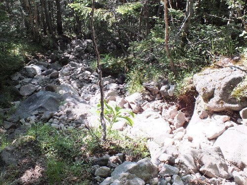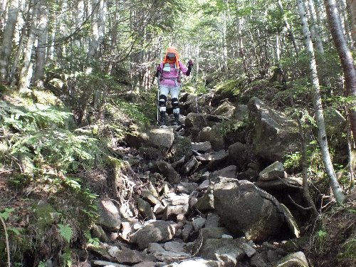 山荘からの下り道、岩がごつごつ |