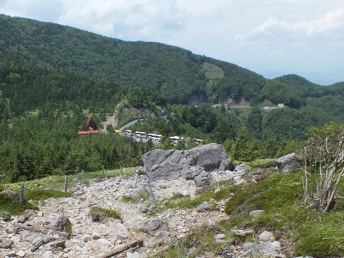 大河原峠が見えてきた。観光バスが多数見える。 |