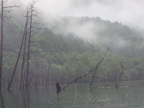 小雨の自然湖もまた、神秘的 |