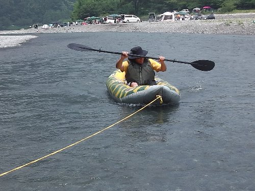 レスキューロープをつないでの、上流へのパドリング練習 |