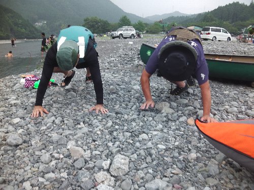 ベースキャンプを設営し、初心者研修、神社前から笹合までの漕艇。