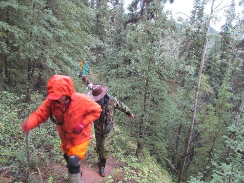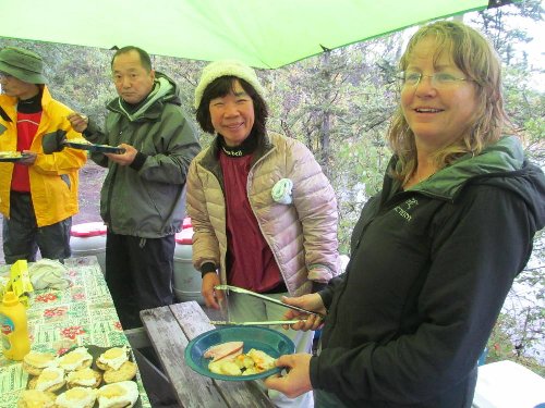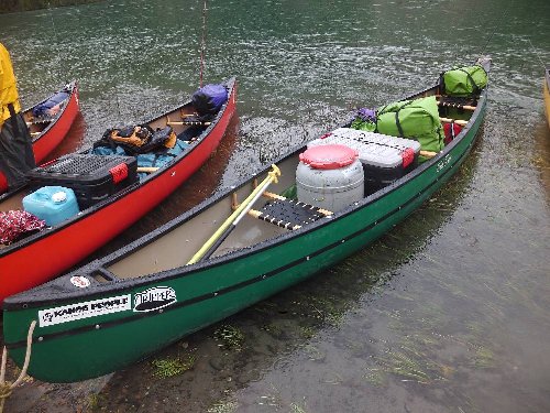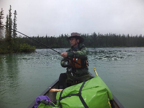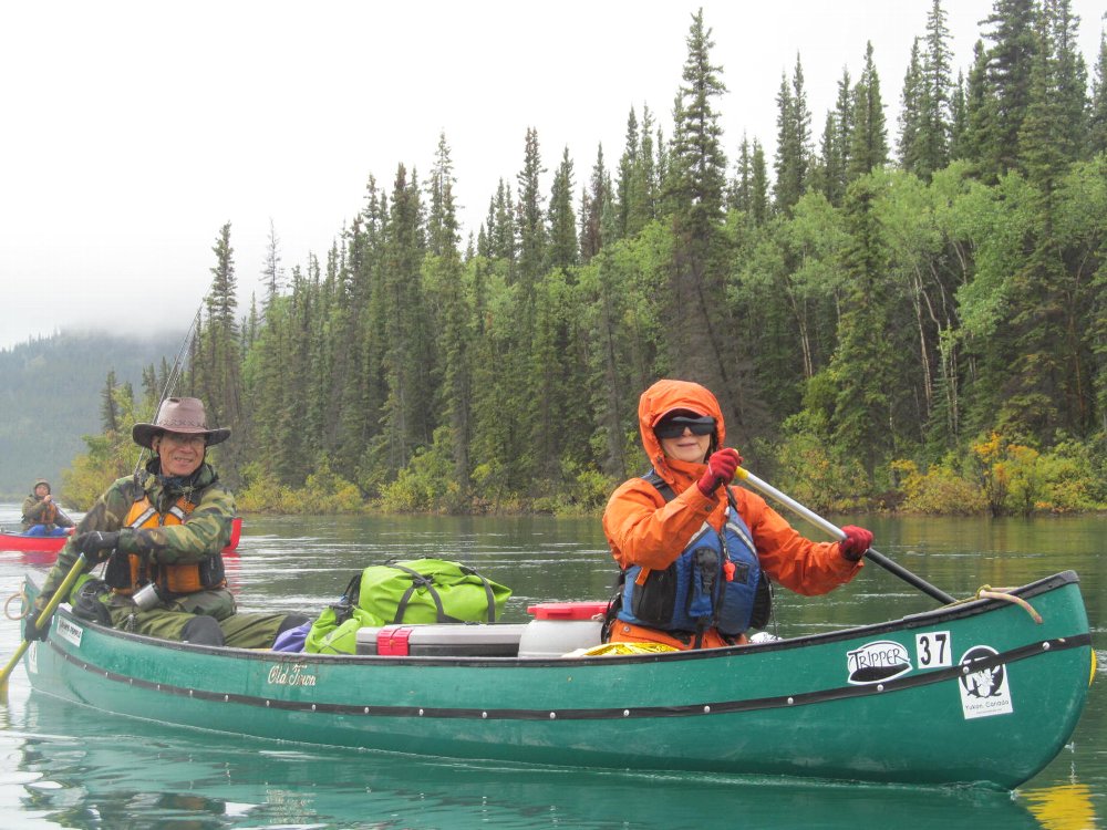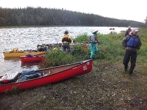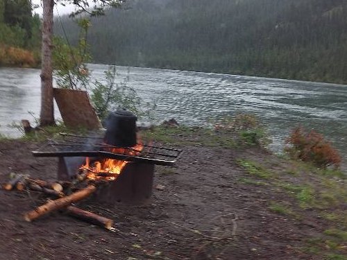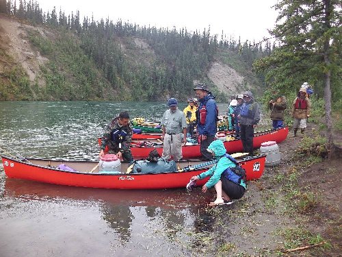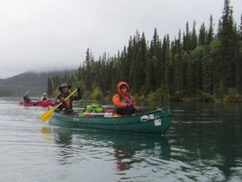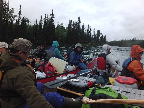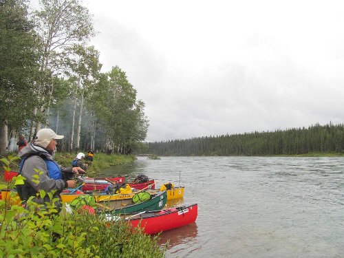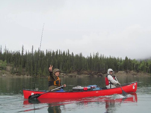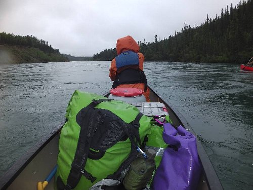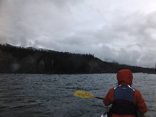 カヌーイスト憧れの ユーコン川 漕艇 2日目 2013.08.26 雨の中 今日は約50km程進む。 流速は早いが 距離を稼ぐため一生懸命漕ぐ |