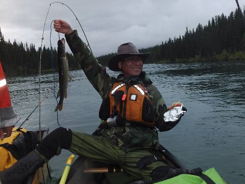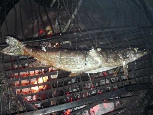 釣り上げたノーザンパイクを自分でさばいて キッコーマン醤油(北米産)をかけて食べた。身が締まっておいしい。完食!