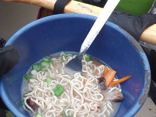 昨夜のビーフステーキが入った 船上 豪華 肉入りラーメン。 |