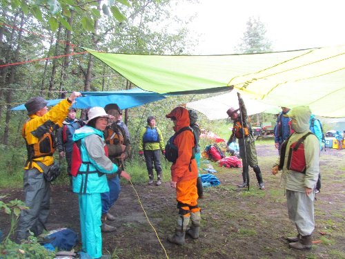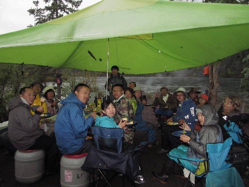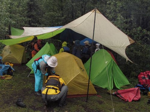 今夜の雨に備え みんなでタープを張ってテント村を作る。これはこれでみんな楽しそうに 工夫を凝らす。