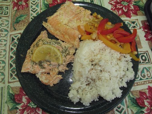 夕食は サーモン。 |