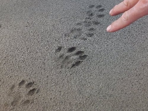甲板にたまった砂に、オオカミの足跡発見。川を泳いできたようだ。 |