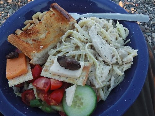ガーリックトーストとパスタ。フレッシュサラダ。 |