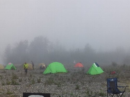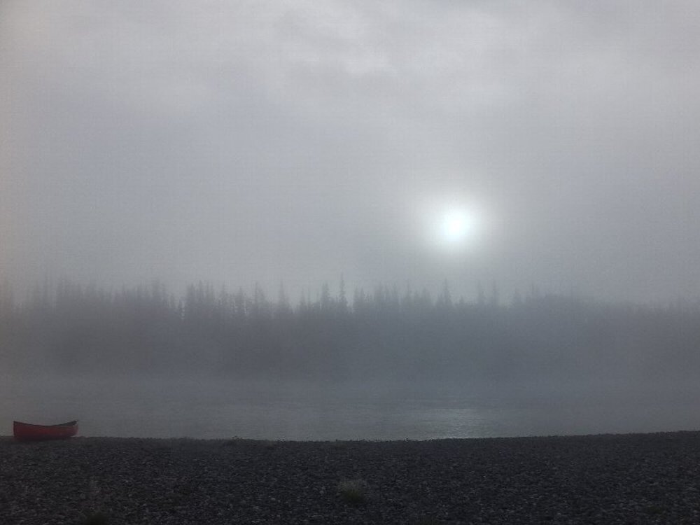 早朝の川霧に覆われたユーコンは 昨夜の興奮を鎮めるかのように この旅一番の冷え込みだ。