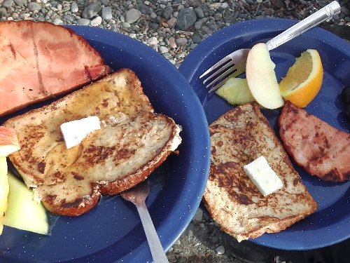 朝食は、ハムステーキとフレンチトースト。 |