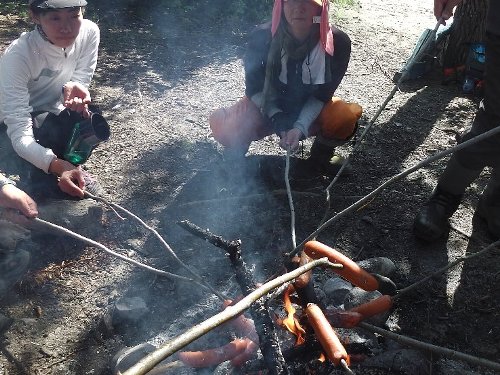 昼食は ホットドック。ソーセージをたき火で焼く。 |