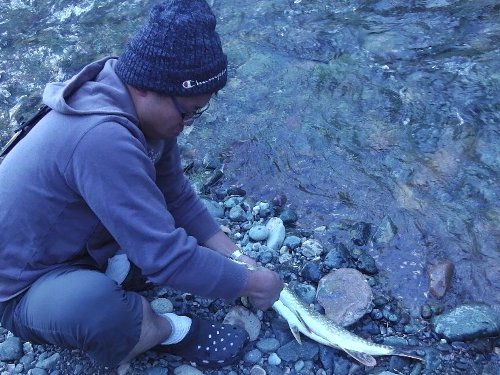 ハルの指導の元 ヨシさんがママが釣った獲物をさばく。 |