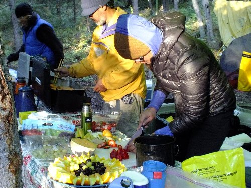 朝の冷え込みに着込んで 朝食準備。フルーツの盛り合わせ |