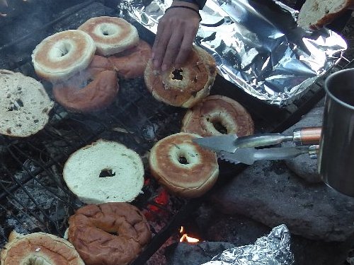 ベーグルを たき火で焼いて 100%ピュアメープルシロップをかける。 |