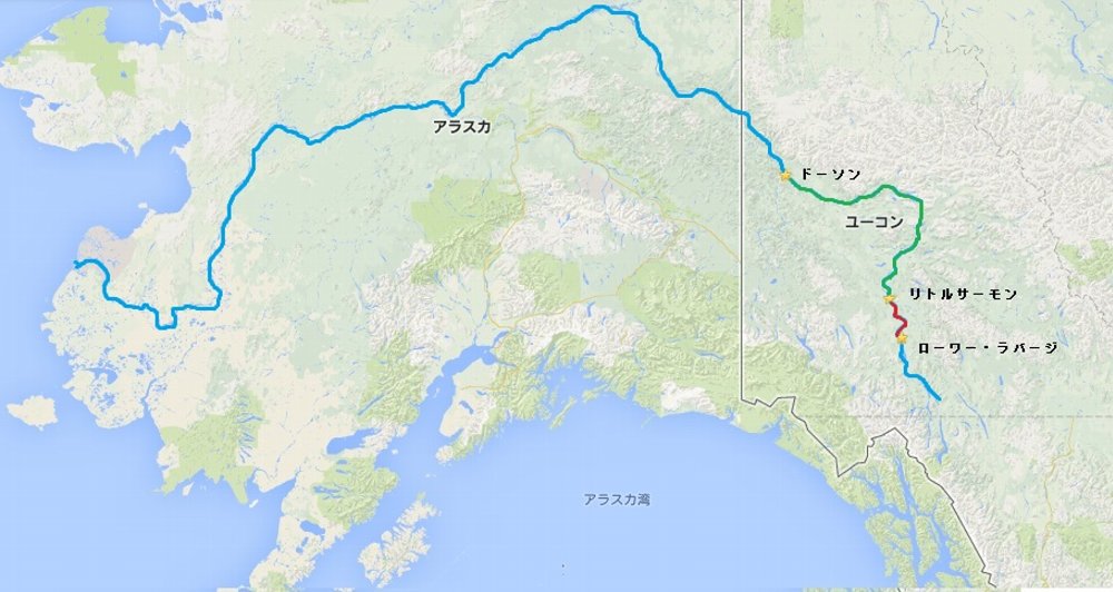 ユーコン川(Yukon River)は、北アメリカ大陸の北西部に存在する河川である。 カナダのユーコン準州、アメリカ合衆国のアラスカ州を流れ、ベーリング海へと注いでいる全長3,700kmの川である。 「ユーコン」というのは「偉大なる川」という意味。 今回、私たちが漕いだのは、ローワー・ラバージからリトルサーモンまでの約165km(赤色の区間) 8/30に幸運にも会えた、野田知佑氏は、8/3からで、ドーソンまでの約700kmを漕いだそうだ。(赤色区間プラス緑色区間) |