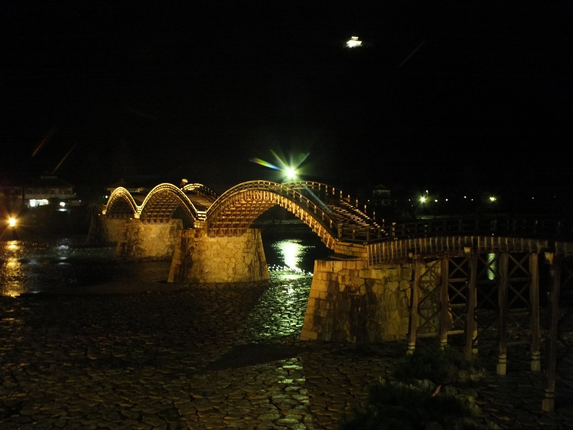 ライトアップされた錦帯橋と、宙に浮いているような岩国城。 幻想的風景。 |