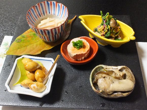 あんきも、ぎんなんの甘辛煮、牡蠣のオイル漬けなど |