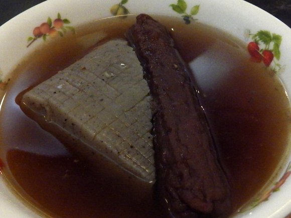 お好み焼きを注文、待つ間におでんを食べる。 関東煮風なのであるが独特な味 |