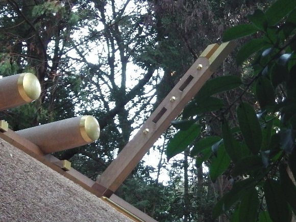 千木の先は水平に切られていて、二つ半の穴がある。 |