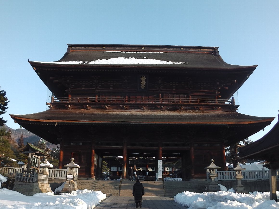 山門(三門) 重要文化財 寛延三年(1750年)に建立された二層入母屋造りの門です。 屋根は大正年間の葺き替え時に檜皮葺きとなりましたが、平成十四年から十九年にかけて行われた平成大修理において、 建立当時と同じサワラの板を用いた栩葺き(とちぶき)に復原されました。 楼上には輪王寺宮筆の「善光寺」と書かれた額が掲げられています。 これは通称「鳩字の額」と呼ばれており、3文字の中に鳩が5羽隠されています。 更に「善」の一字が牛の顔に見えると言われ、「牛に引かれて善光寺参り」の信仰を如実に物語っています。 (善光寺HPより) |
