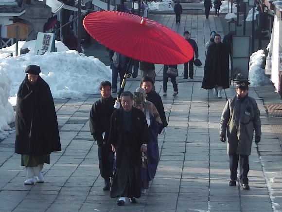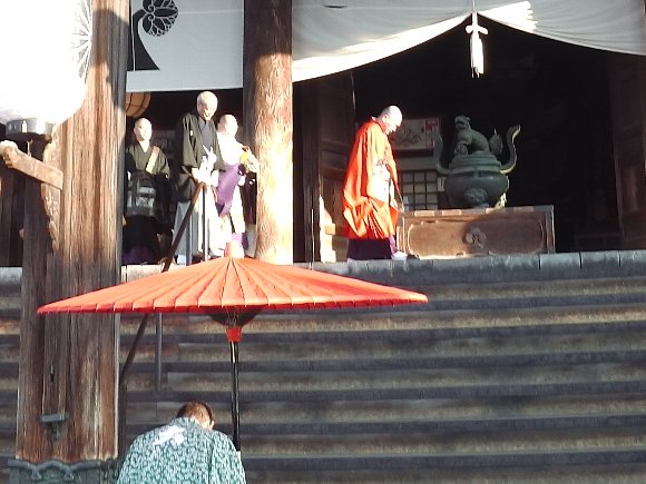 お貫主様が朝のお勤めを終わり本堂からでてくる。 |