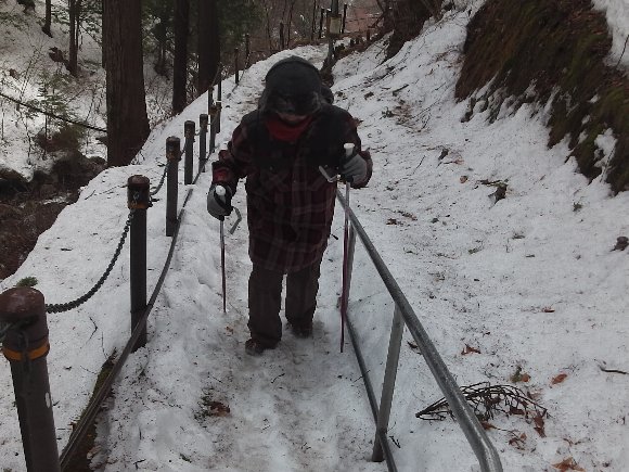 雪の坂道なのでストックを持ち |