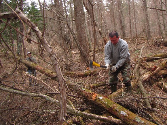 斧などを駆使し、全員協力して倒木を除去 |