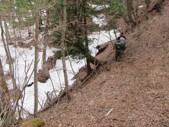突然、道がなくなり 歩いて偵察 「ここまで来れるが先がない、落ちたらおしまい」 |