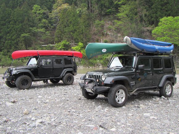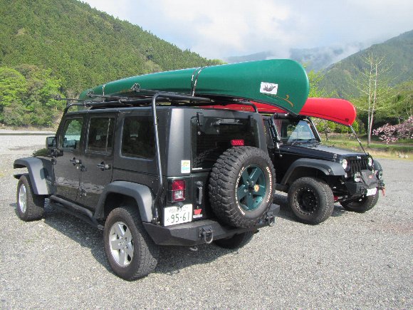 神社前、 Jeepアンリミに積まれた チャールズとキャンパー |