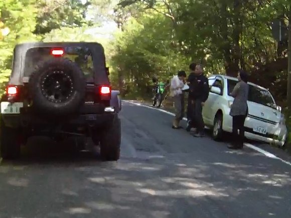 ![]() 路肩に脱輪している車両が・・・・、 |