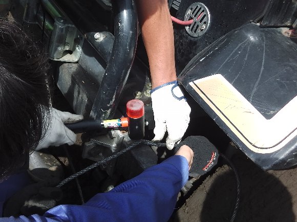ウィンチワイヤーのキンクをハンマーでたたき 修理 |