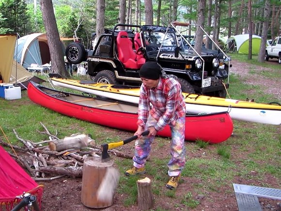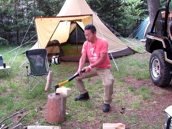 ![]() ベースキャンプに戻り、早速薪割りする Georgeさん |