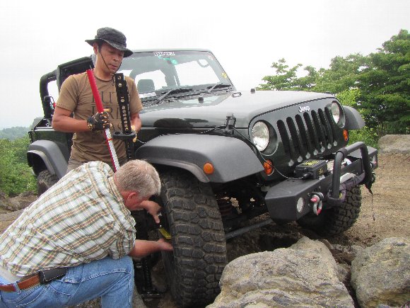 亀になったBrad さん を ハイリフトジャッキでレスキューする TERU-JKさん |