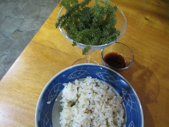 夕食時 うみぶどう と ジューシー(八重山炊き込みご飯) |