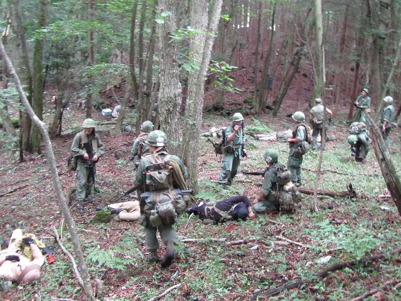 米兵は、部隊ごとに時計回りでそのポイントを見つけて侵入していき、共産勢力の陣地を探す。