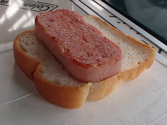 スパムを焼いてパンにのせ |