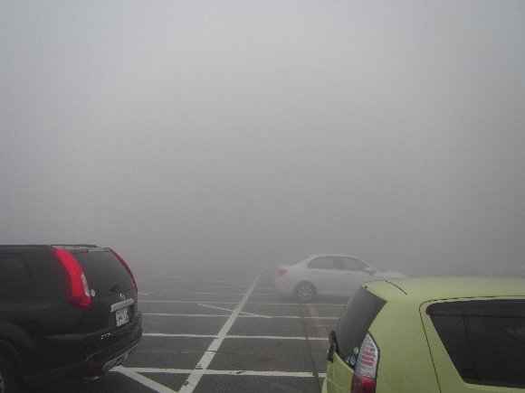 標高1,260mのスカイテラス駐車場は深い霧 |